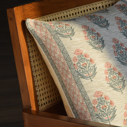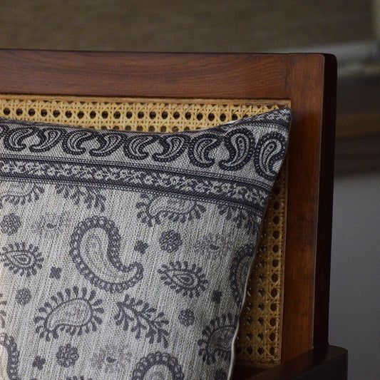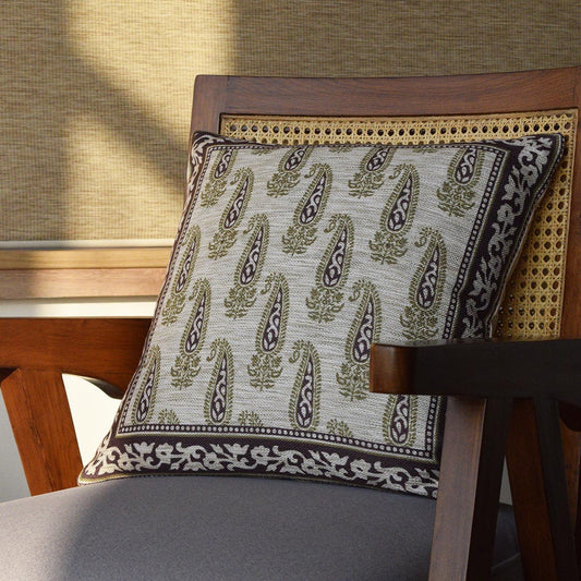 Elevate your home décor with this exquisite cushion cover from Studio Oblique, inspired by the rich heritage of Indian craftsmanship and nature's timeless beauty. Featuring a woven linen base, the design showcases intricate digital print paisley and floral motifs—classic elements rooted in Persian and Mughal art.