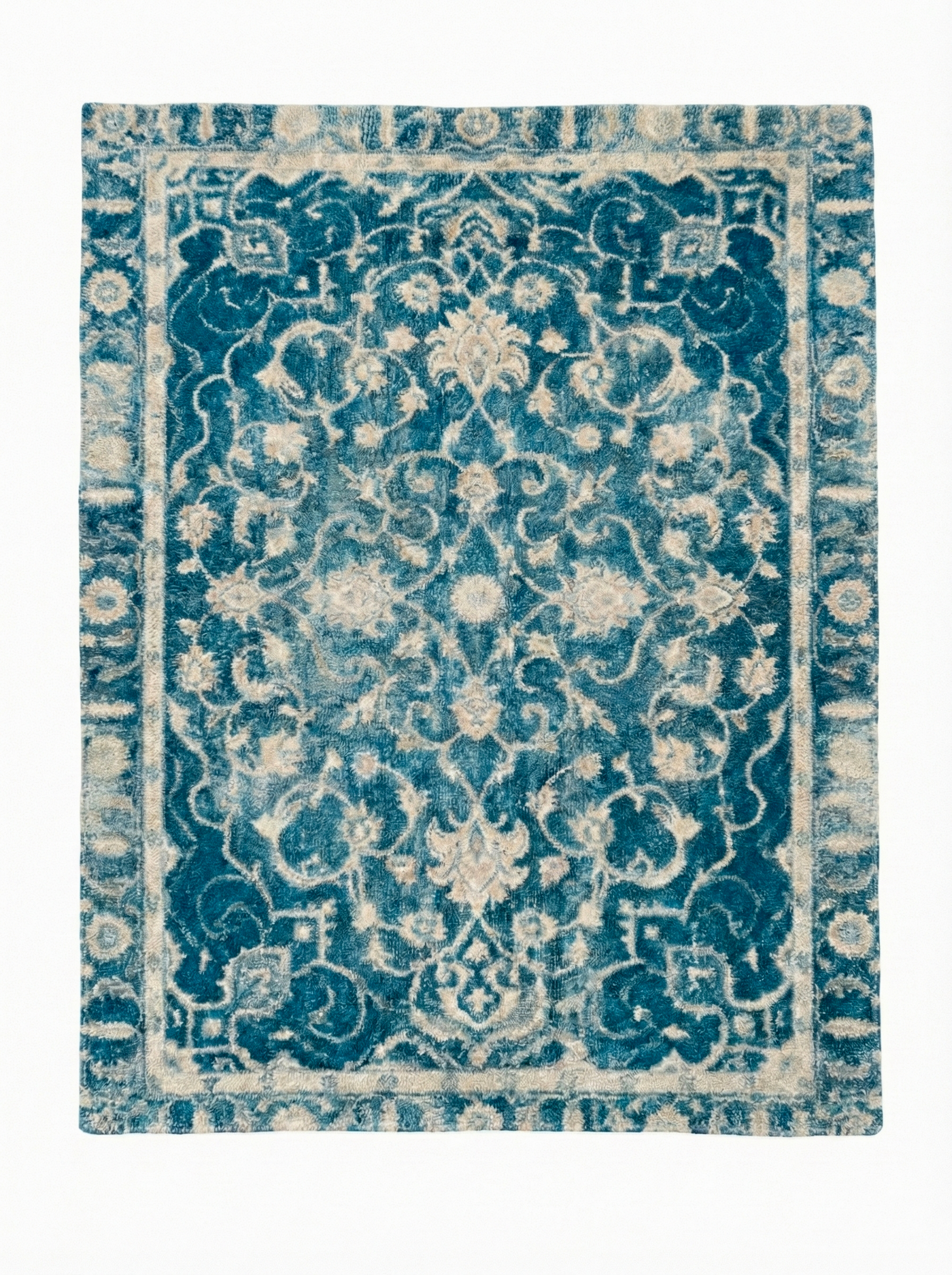 An elegant interplay of tradition and restraint, this rug features a softly faded medallion design rendered in deep, calming blues. The pattern feels time-worn yet refined, lending character without excess. Designed to ground a space with quiet confidence, it brings a sense of balance, depth, and understated luxury to everyday living.